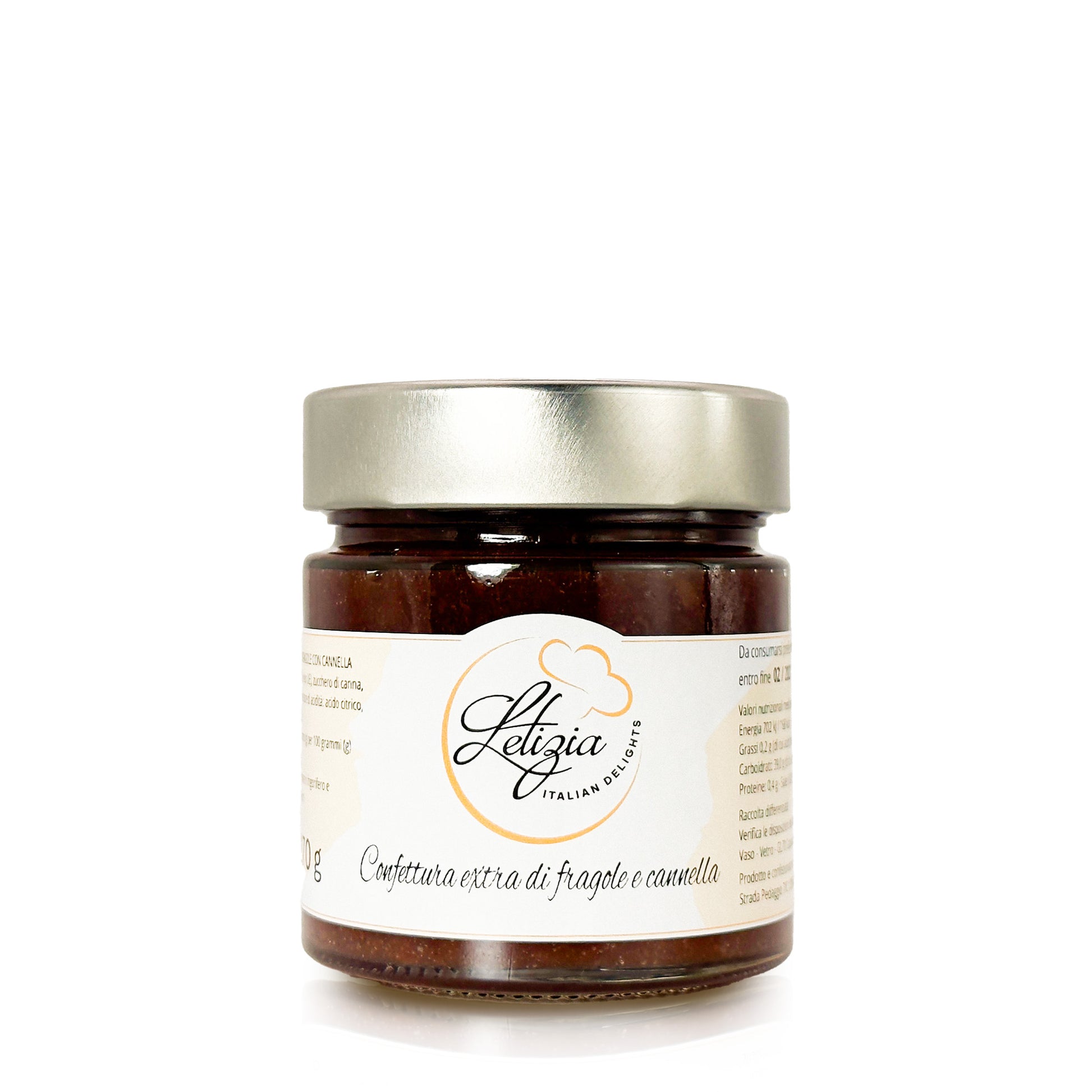 Strawberries (EU and non-EU), cane sugar, gelling agent: pectin, acidity regulator: citric acid, cinnamon 0.1% (non-EU).