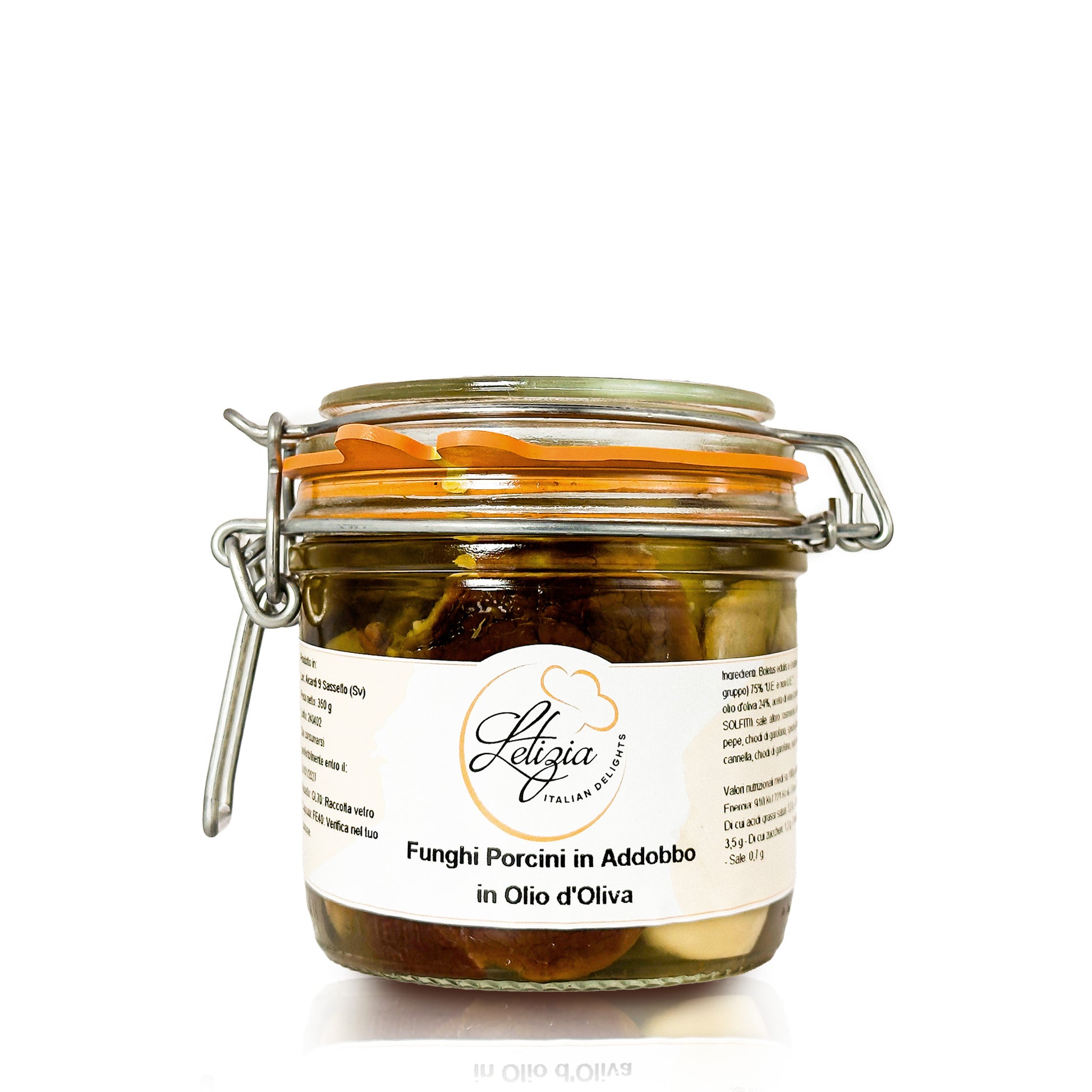 Boletus edulis and related group 75% (EU and non-EU), olive oil 24%, wine vinegar (contains sulfites), salt, bay leaf, rosemary, garlic, pepper, cloves, spices (thyme, pepper, cinnamon, cloves, nutmeg).