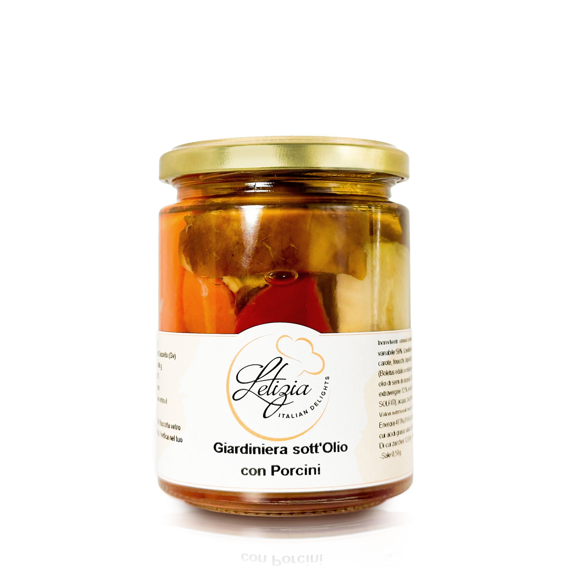 Vegetables in varying proportions 59% (cauliflower, peppers, carrots, fennel, green beans), porcini mushrooms (Boletus edulis and related group) 8%, sunflower seed oil, extra virgin olive oil 12%, wine vinegar (contains sulfites), water, sugar, sea salt.
