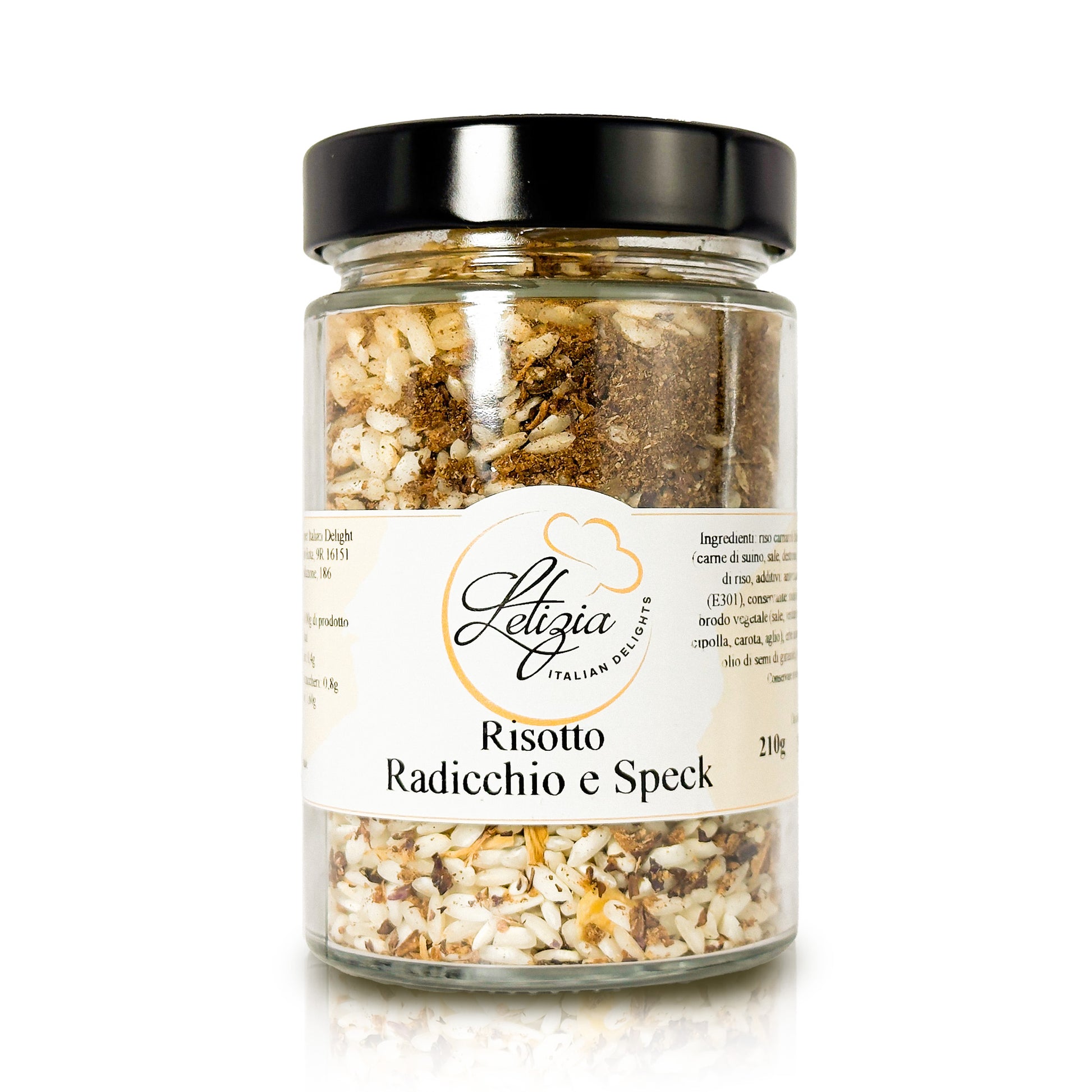 Italian Carnaroli rice 91%, IGP speck (pork meat, salt, dextrose, aromas, supports: rice flour, additives: antioxidants: sodium L-ascorbate [E301], preservative: sodium nitrite [E250]) 3.5%, vegetable broth (salt, dehydrated vegetables [tomato, onion, carrot, garlic], sugar, aromatic herbs, spices, flavoring, sunflower seed oil), radicchio 1.8%, onion.